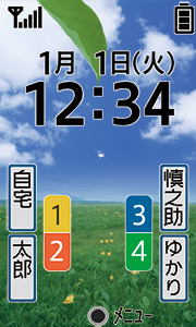 そして、キーでもっとも特徴的なのは、方向キーの周囲に備えられた4つの「楽ともボタン」だ。4色に塗り分けられた4つのキーには、よく連絡する相手を登録することができ、これと同じグラフィックが画面上に表示され、そこには登録した相手の名前などを表示できるようになっている。ちなみに、楽ともボタンに何も登録されていないときは、電話帳を参照するか、直接登録するかを選ぶ画面が表示されるため、わかりやすい。