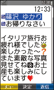 | 待受画面 | メニュー画面 | 受信メール表示画面 | 通話中に方向キーの右を押すと「くっきりトーン」、左を押すと「スロートーク」に切り替えられる |