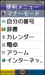 また、辞書をはじめ、電卓やカレンダー、アラームといった便利な機能は、決定ボタンを押して表示されるメニュー画面からも個々の機能は呼び出せるが、慣れていないユーザーには何階層かをたどらなければならないため煩わしく感じられてしまう。そこでWX02SHは、方向キーの上を押すだけで、こうした機能がすぐに起動できる「便利メニュー」が用意されており、すぐに各機能を起動できる。