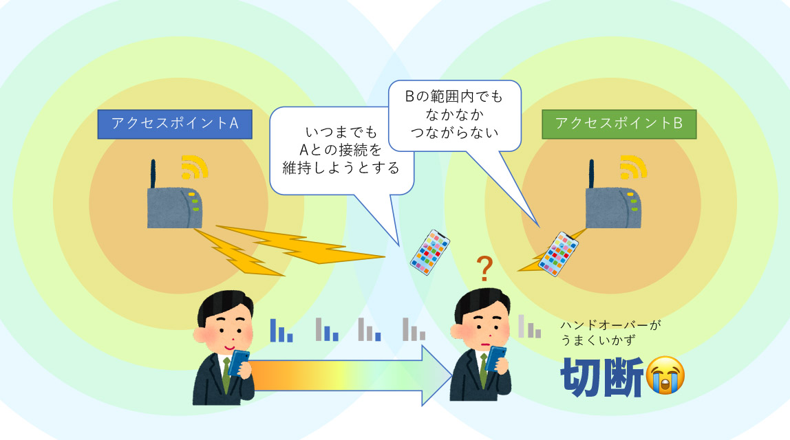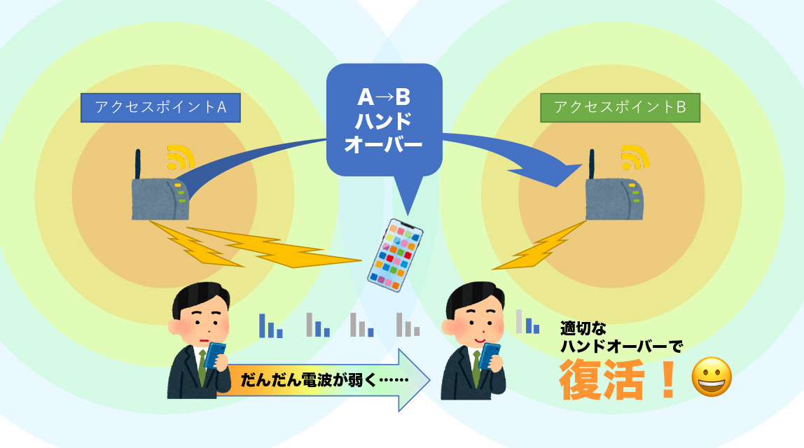 ハンドオーバーが「上手」な製品は、現在のアクセスポイントと次のアクセスポイントの電波状況を適切に把握し、最適なタイミングで、素早く接続先を切り替える。