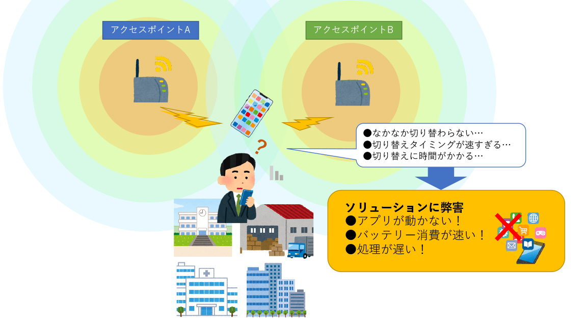 こうしたハンドオーバーの問題は、実際にスマートフォンを利用するユーザーだけでなく、オフィスや病院、学校などに、自社のソリューションを販売するSIerを悩ませる大きな原因ともなっている。