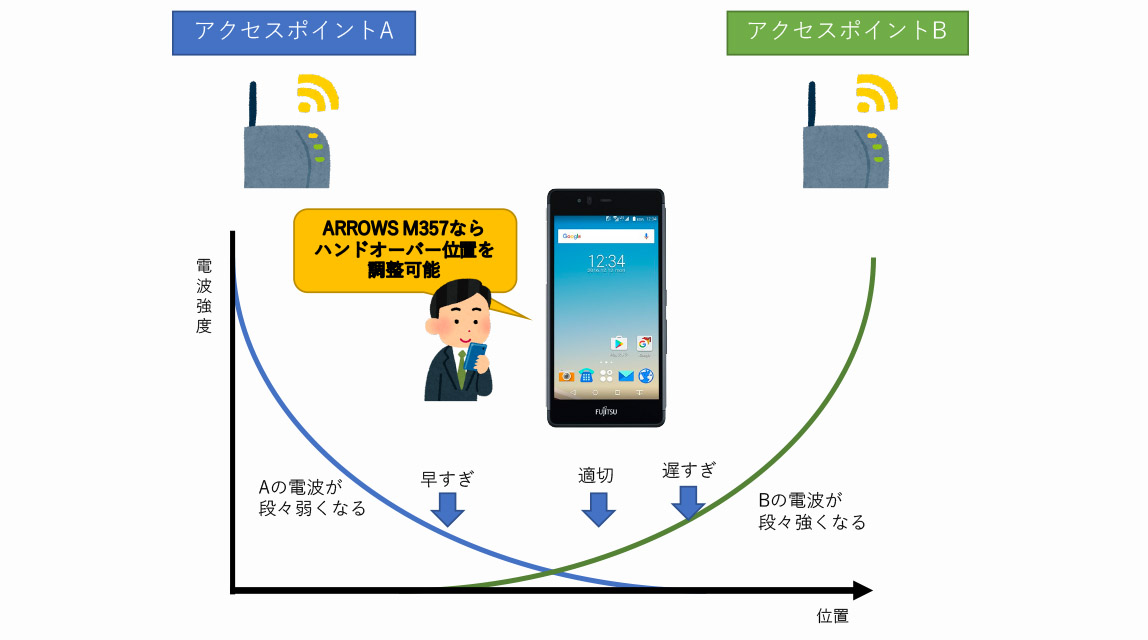 建物の種類や広さ、用途など、敷設されるWi-Fiネットワークは環境によって異なるため、従来のOSまかせのハンドオーバーでは、どうしても対応しきれない環境が出てきてしまうが、ARROWS M357なら環境に合わせて端末側の設定を調整可能ということになる。
