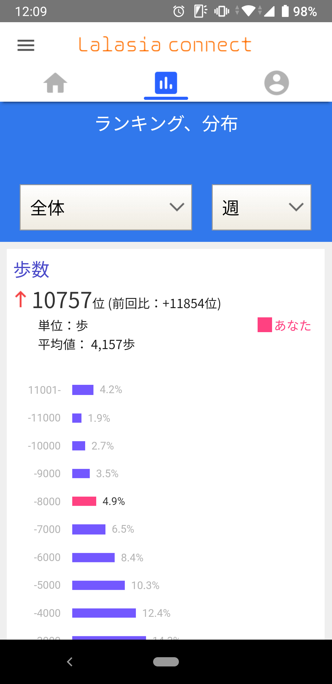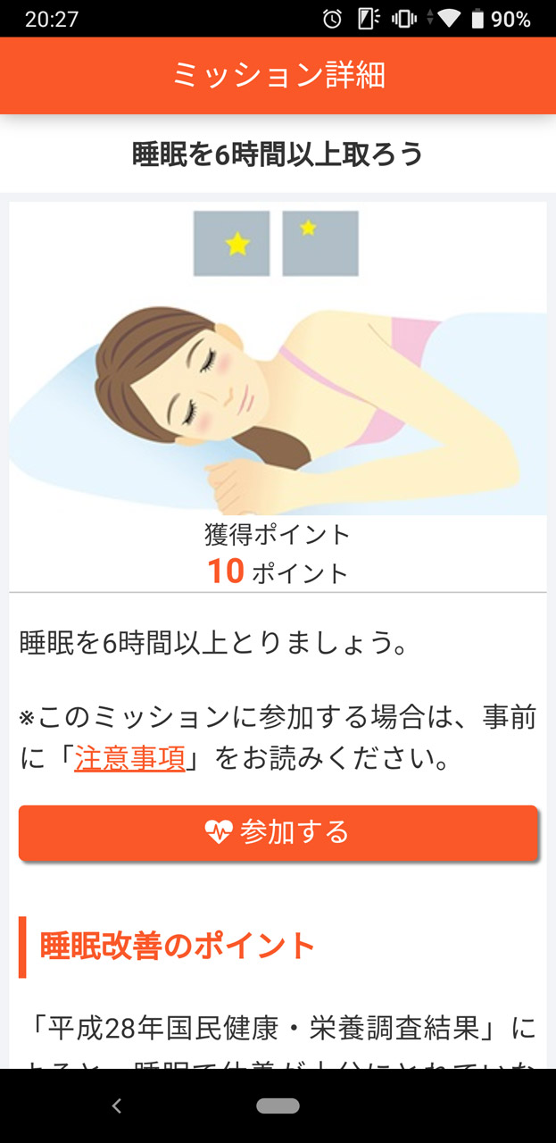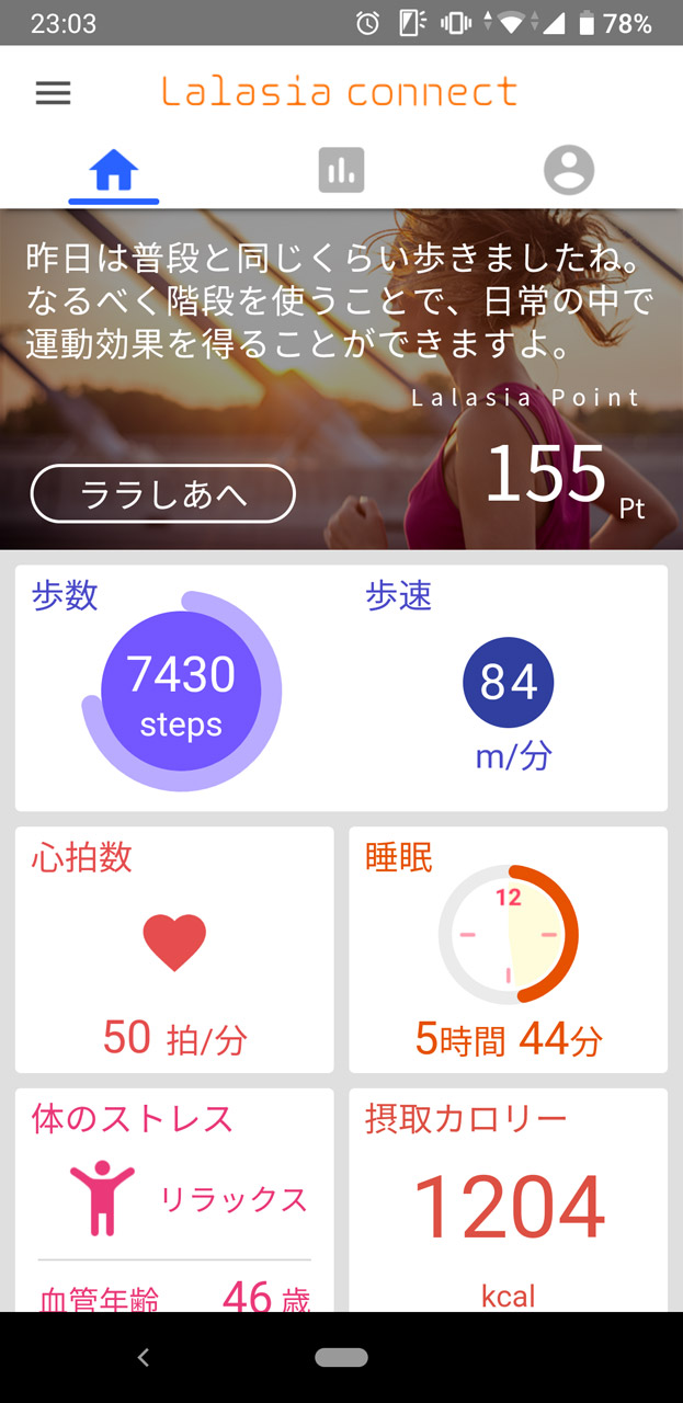 初日のトータルの歩数は「6832歩」、「食事バランスチェック」では「9項目」を達成できた。しかし睡眠時間は目標の6時間に足りず「4時間59分」で、ララしあの「ミッション」で参加していた睡眠6時間のチャレンジに失敗してしまった。これについては翌日以降、早めに寝床につくなどして改善していくしかない。