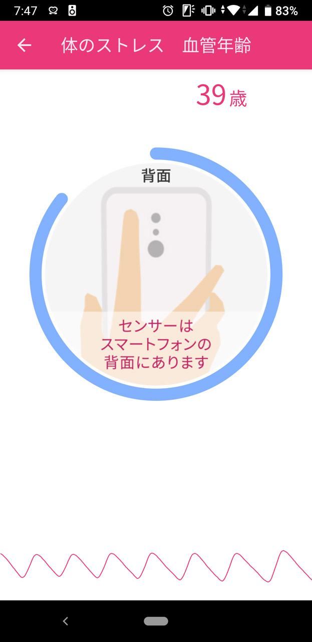 脈波センサーに指を乗せて少し待つと計測開始 血管年齢やストレスの程度がわかる