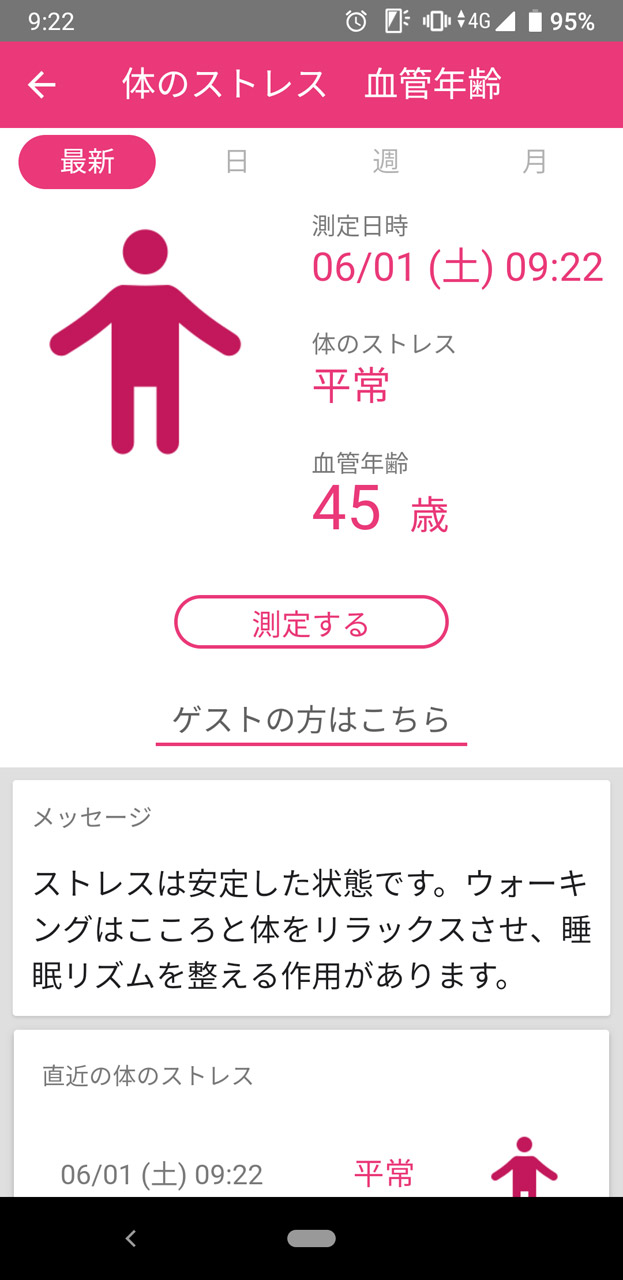 ララしあ生活は3日目、平日の月曜日となった。ここからはダイジェストでお伝えしようと思うが、一番ショックだったのは月曜日の朝計測した体重が「75.3kg」と前日の0.9kgアップになっていたこと。運動したにもかかわらず1kgも増えるとはどういうことなのか。やはり見栄えにこだわって食事メニューが増えてしまっているのが良くなかったのか。おかげで(?)血管年齢も「42歳」へとアップしてしまった。状態としては「リラックス」だったのが唯一の救いだ。