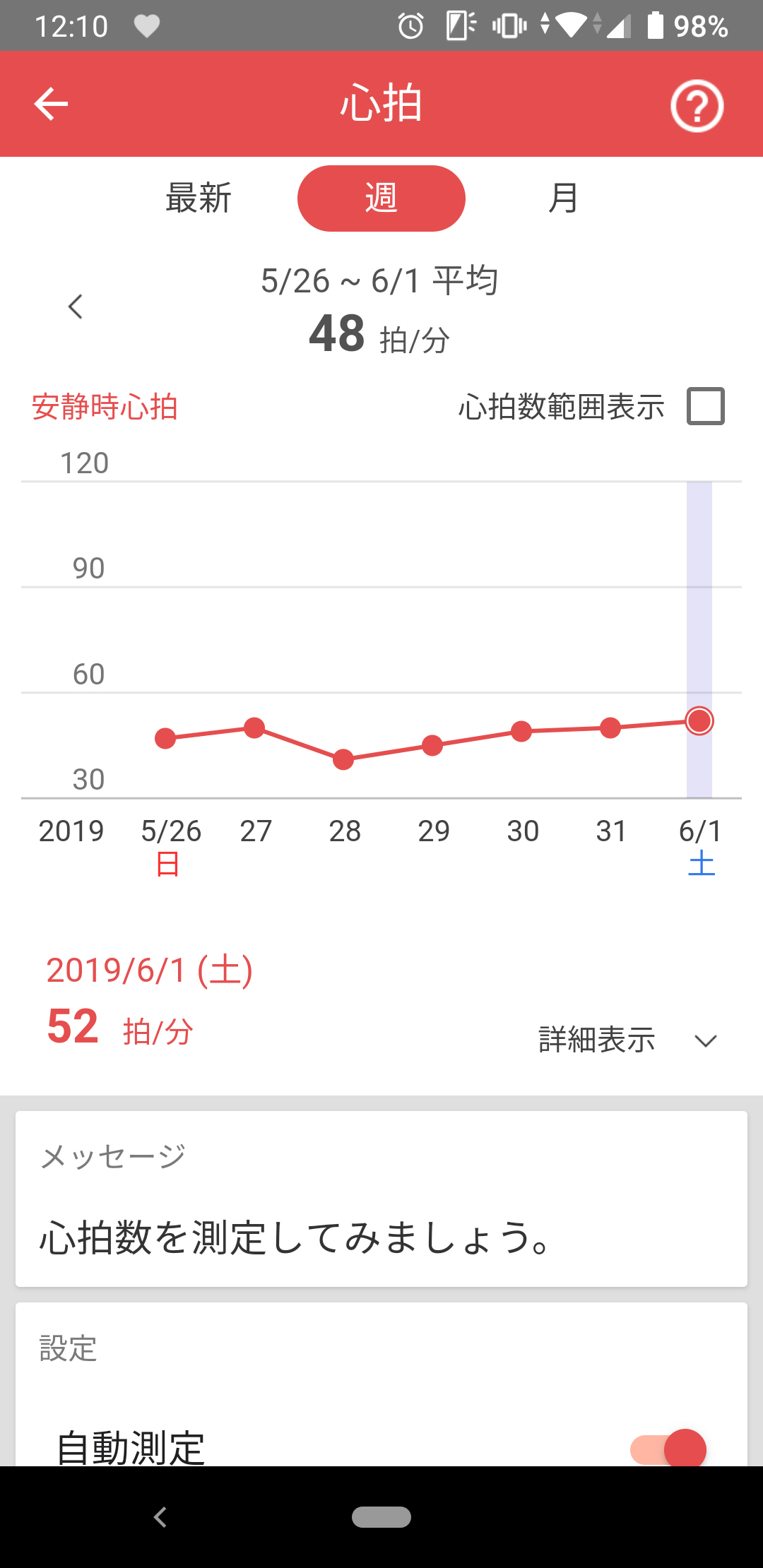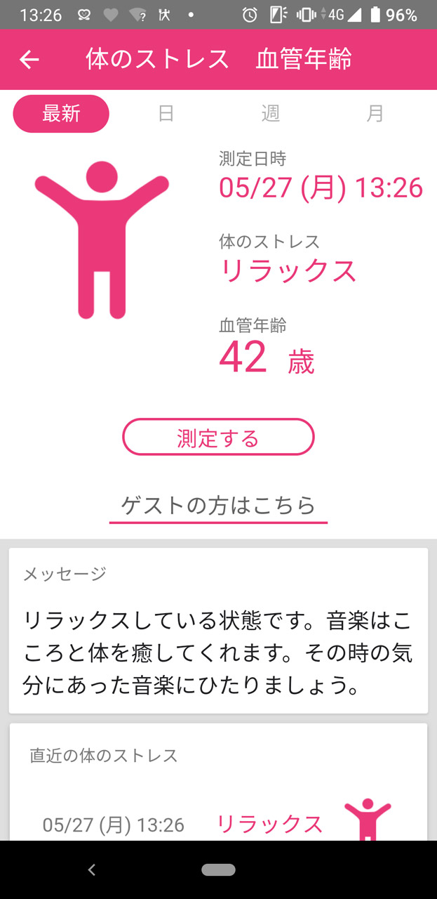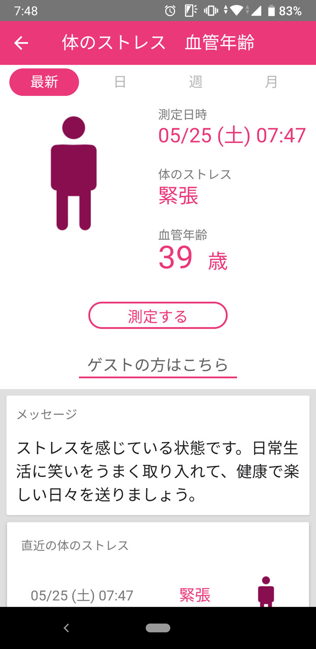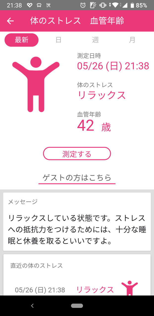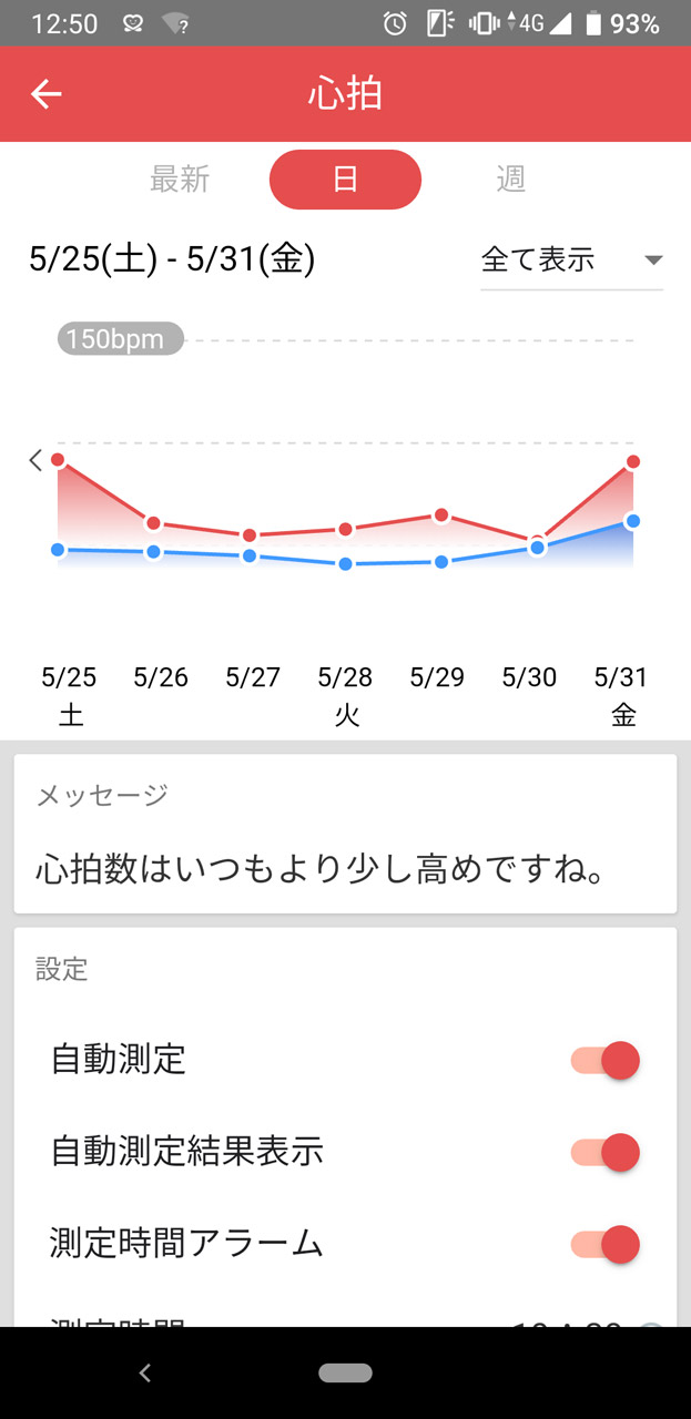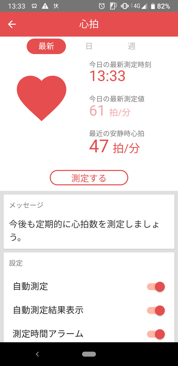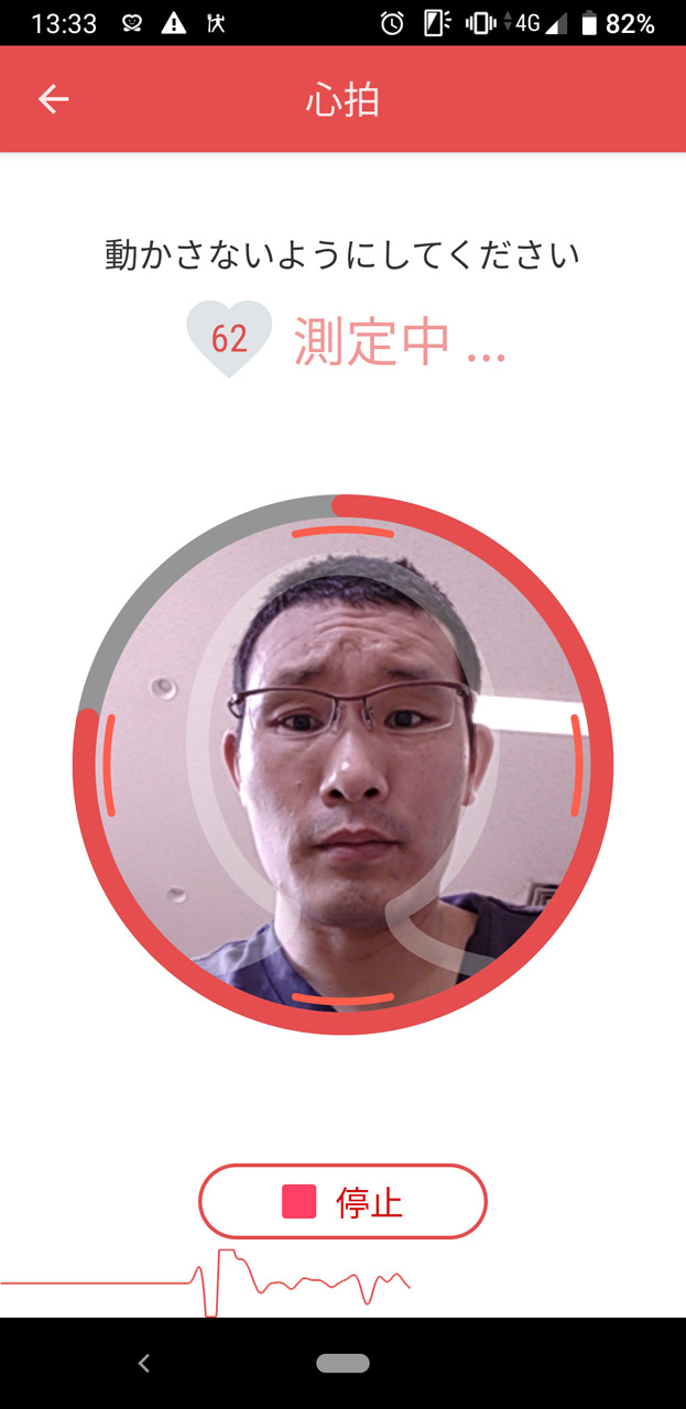 インカメラに顔を映すだけで心拍を計測できる独自技術も(顔が少しいかつくなってしまった……) 定期的に計測して心拍の推移を追っていくことができる