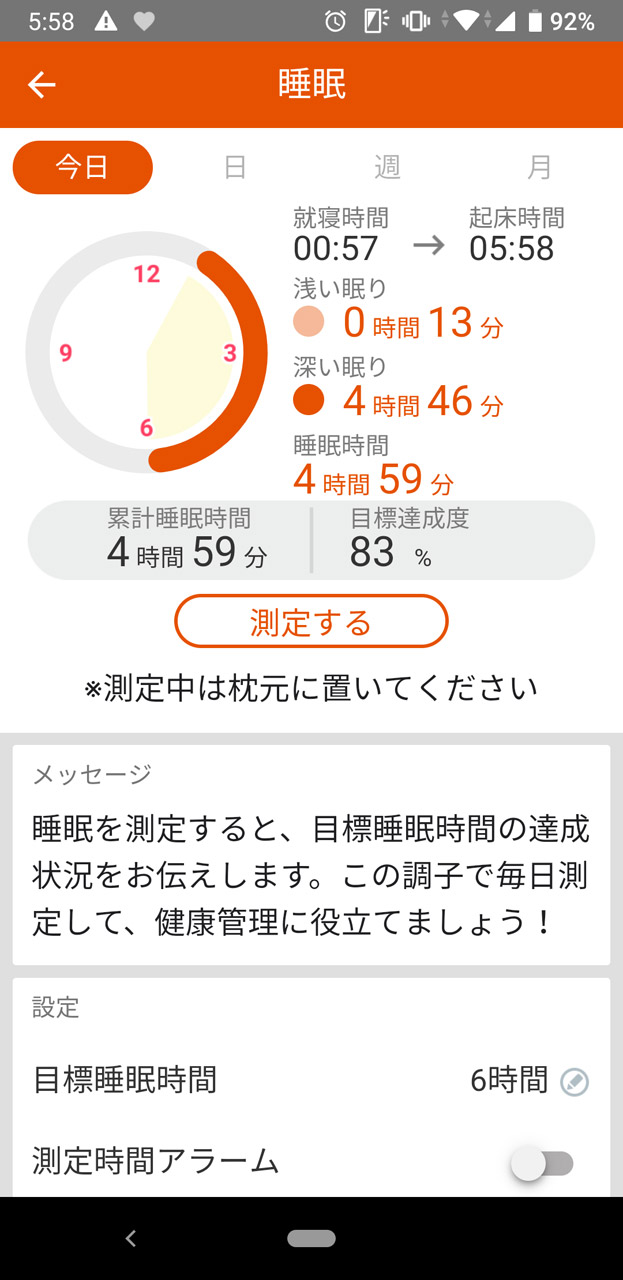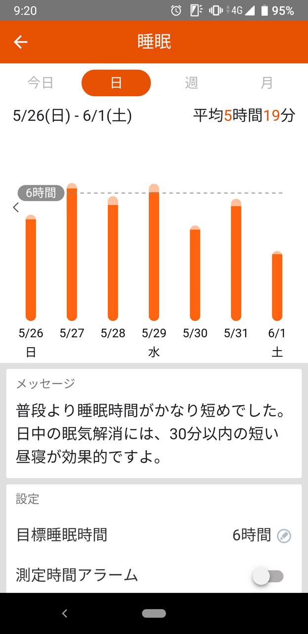 初日の睡眠時間は4時間59分と、目標より1時間少なかった ララしあで6時間以上睡眠をとるミッションに参加していたが、失敗に終わった。初日からこれは厳しい……