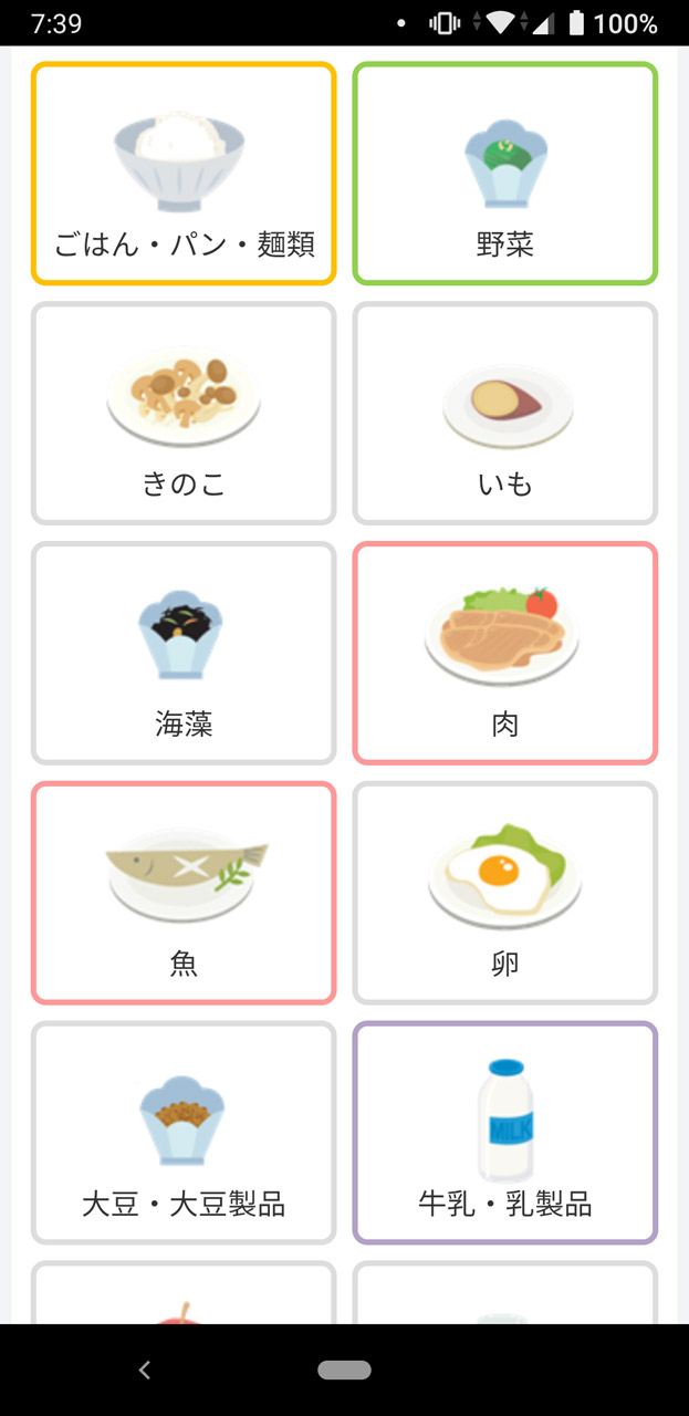 「食事バランスチェック」では、食べたもののカテゴリーを選択していくだけの簡単な操作 毎日の食事のバランスを把握できる