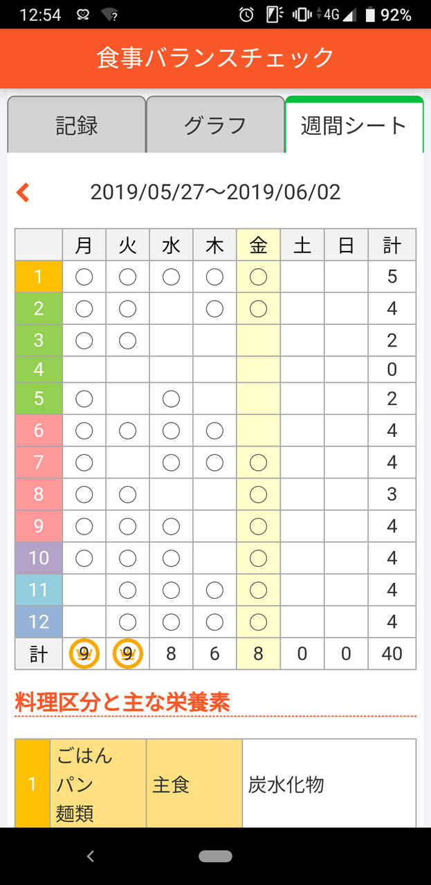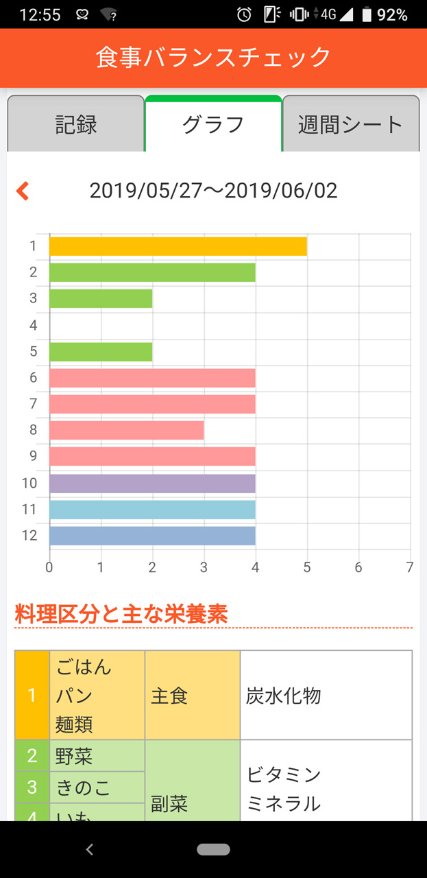睡眠はやや不足気味かも。6時間を超えたのは2回のみだった…… 食事バランスチェック。キノコをほとんど食べなかったのが悔やまれる