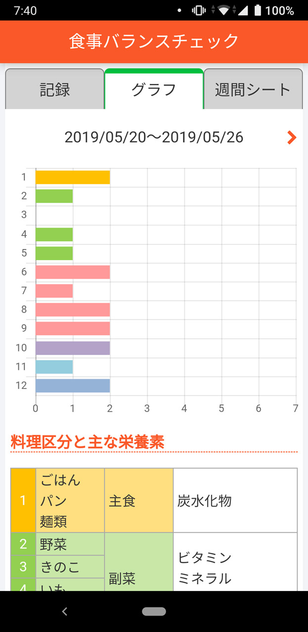 「食事バランスチェック」もきちんと記録。グラフ表示すると不足しているものが一目でわかる