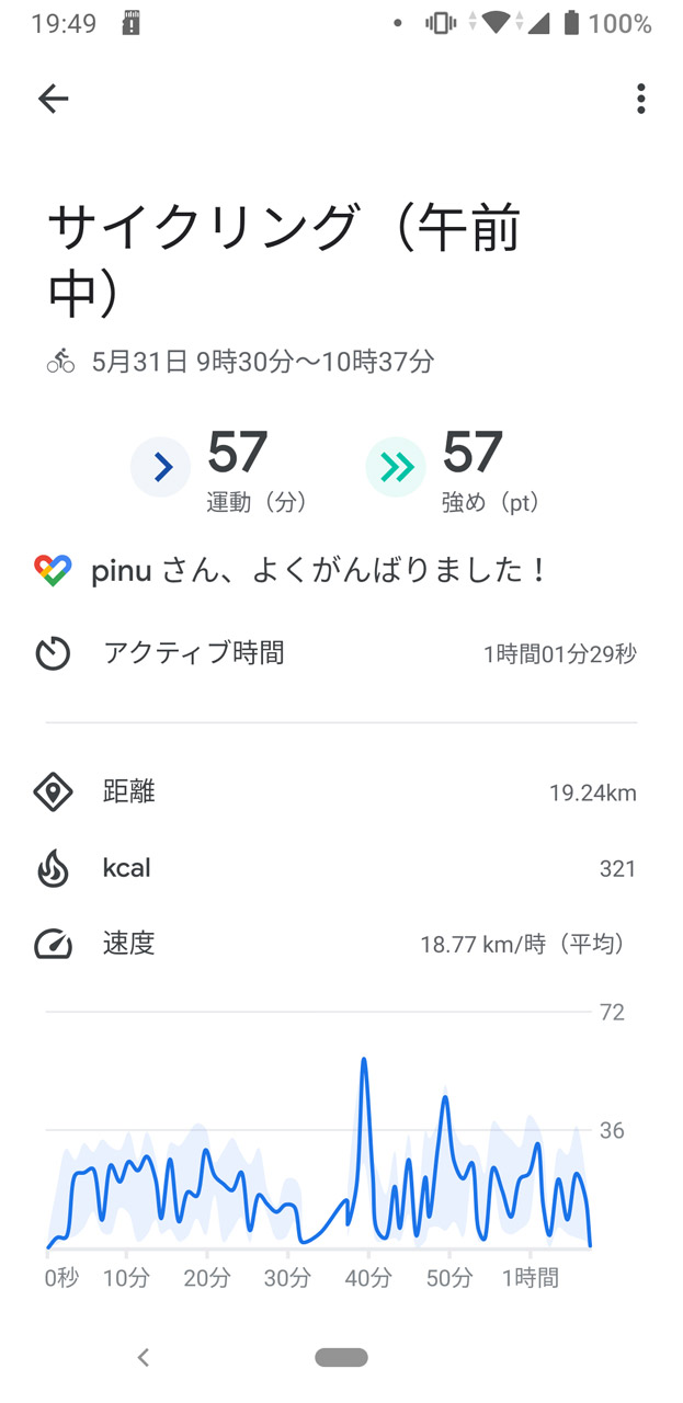 食事のほうは、朝食が「チーズ入り塩パン」と「ぶどう」、「ヨーグルト+シリアル」で「391キロカロリー」。昼食は外食で「イタリアンハンバーグ」と「辛味チキン」で「932キロカロリー」。夕食はバリエーションを意識し「白米」「味噌汁」「サラダ」「刺身」「納豆」で「582キロカロリー」の摂取。「食事バランスチェック」では2日連続の「9項目」となった。やはり写真に撮って他の人に見せることを意識すると、メニュー数や彩りを気にしてしまう。これがカロリーアップにつながらなければいいが……。