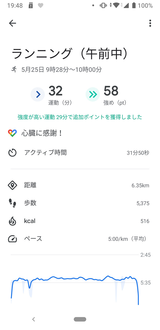 体重は朝食前で「74.6kg」。わりとヤバい。長期的な目標は「67kg」なのである。危機感を覚え、さっそくランニングに出かけることにした。もちろんarrows Be3と一緒に。Google Fitのエクササイズ機能を使い、6.35kmを32分で走る。