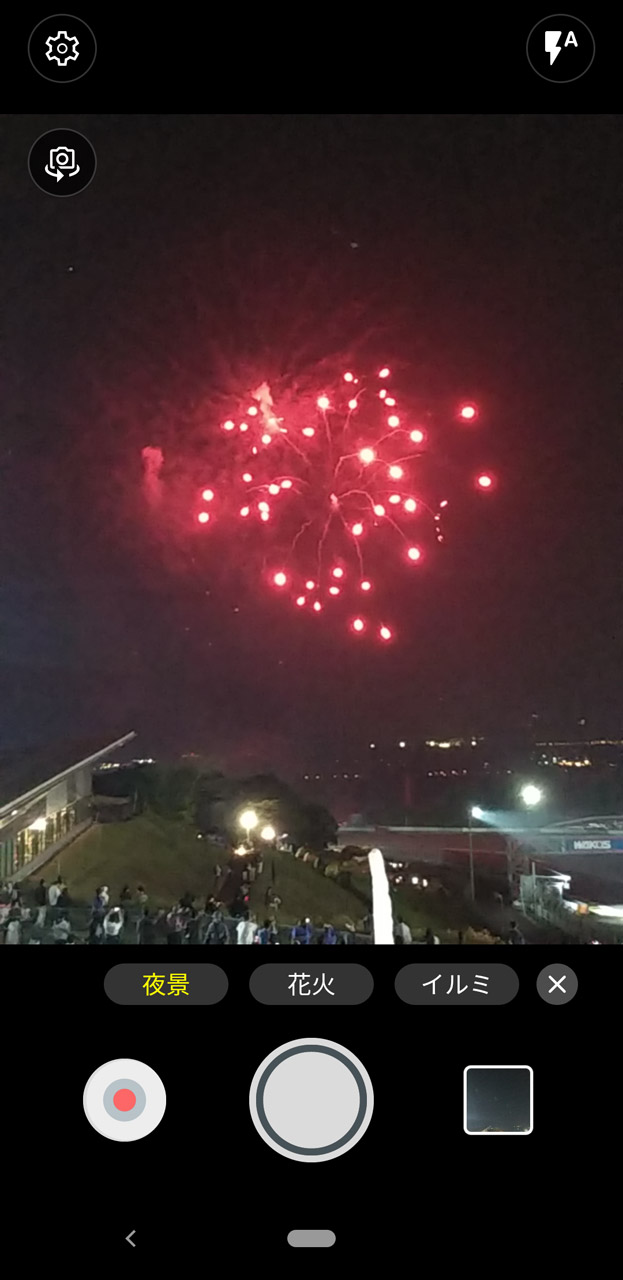 サイクリング中に出会った印象的な景色をarrows Be3でパチリ。AI機能で花を認識し、最適な画質に調整してくれる あまり見栄えするとは言えない食事もきちんと認識 夜景もAIで瞬時に判別。思い出をきれいな写真で残せる。さらに、花火のときは「花火」ボタンを押すだけで花火に最適なモードになる