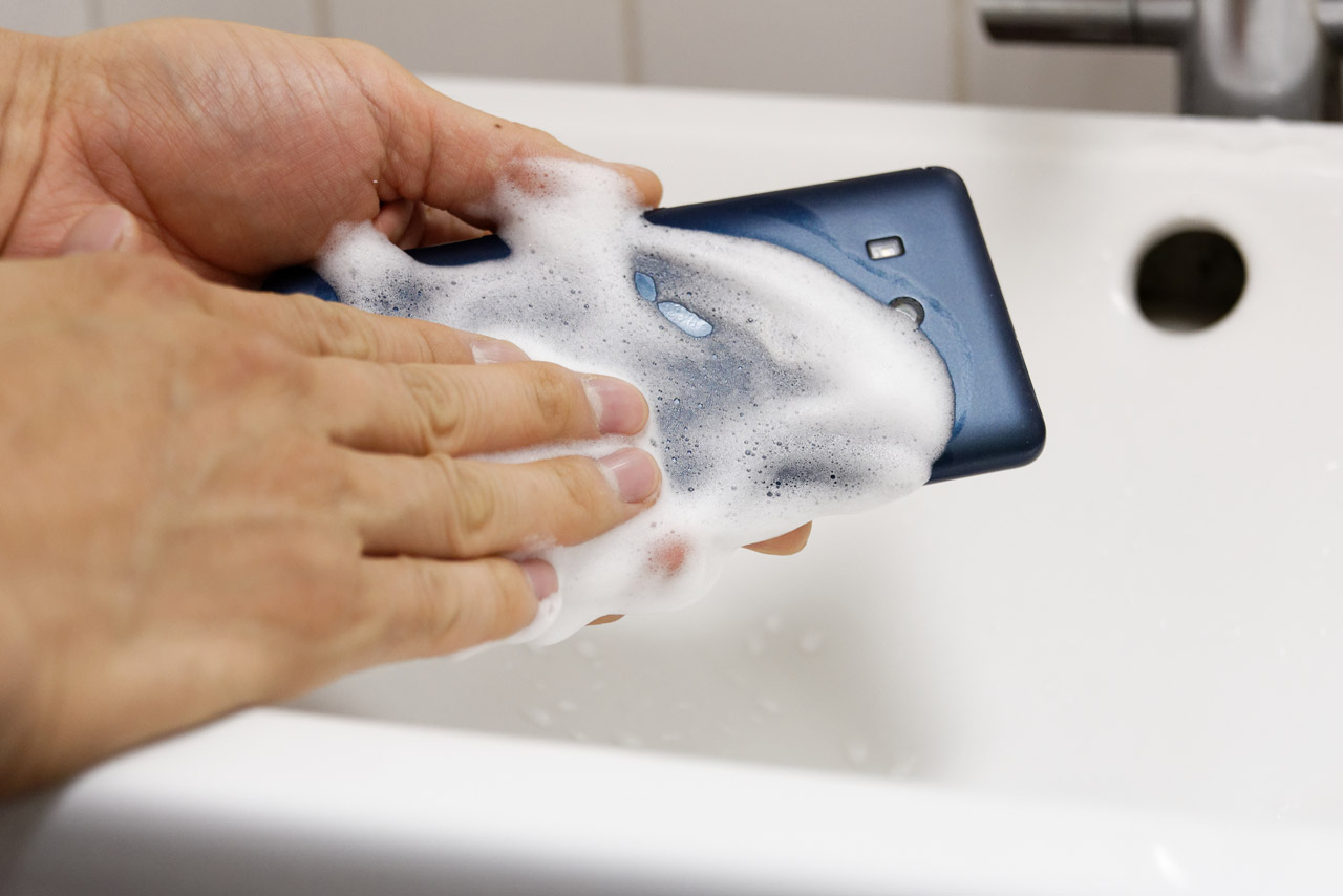 でもって、こうやってアウトドアで使ったり、長期間にわたって使い続けたりすると、arrows Be3が汚れてしまうこともある。しかしそこは泡タイプのハンドソープや国内メーカーの食器用洗剤で「洗えるスマホ」2。気になったらいつでも手洗いOKで、常に清潔に使えるのだ。