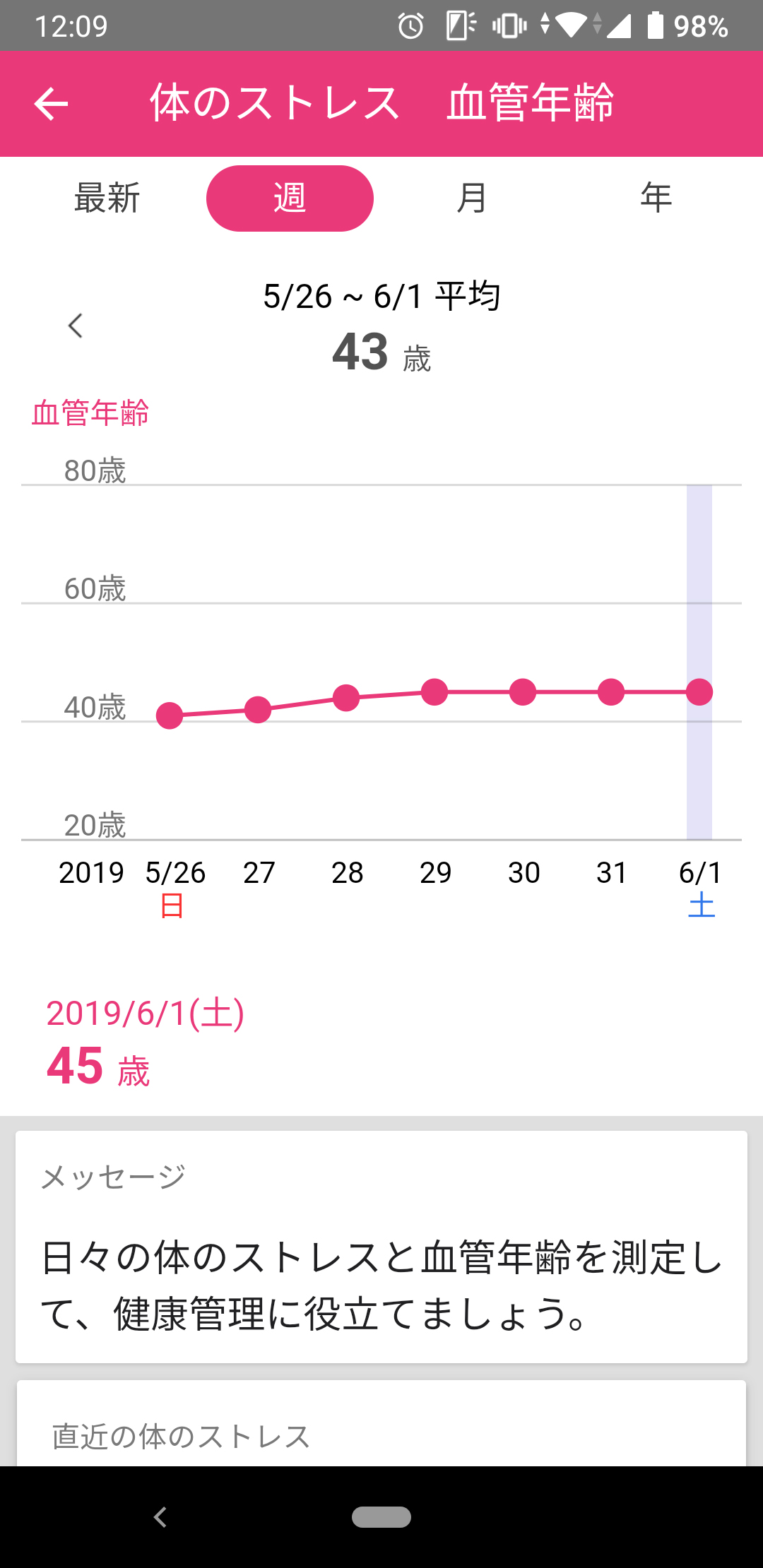 これによって筆者の心身の状態や体重、食べているもの、睡眠時間といった私生活のあらゆる部分がつまびらかになってしまう。恥ずかしいけれどそれは仕方ないとして、1週間も継続すれば健康状態の推移もわかるようになるはず。予想では、体重や食事、カロリーを把握することで、バランス良く食べつつ体重を減らそうという心理が働き、血管年齢は若く、体重は減少傾向に。最終的にシュッとする目標を達成できるのではないか、と思っているのだが……。