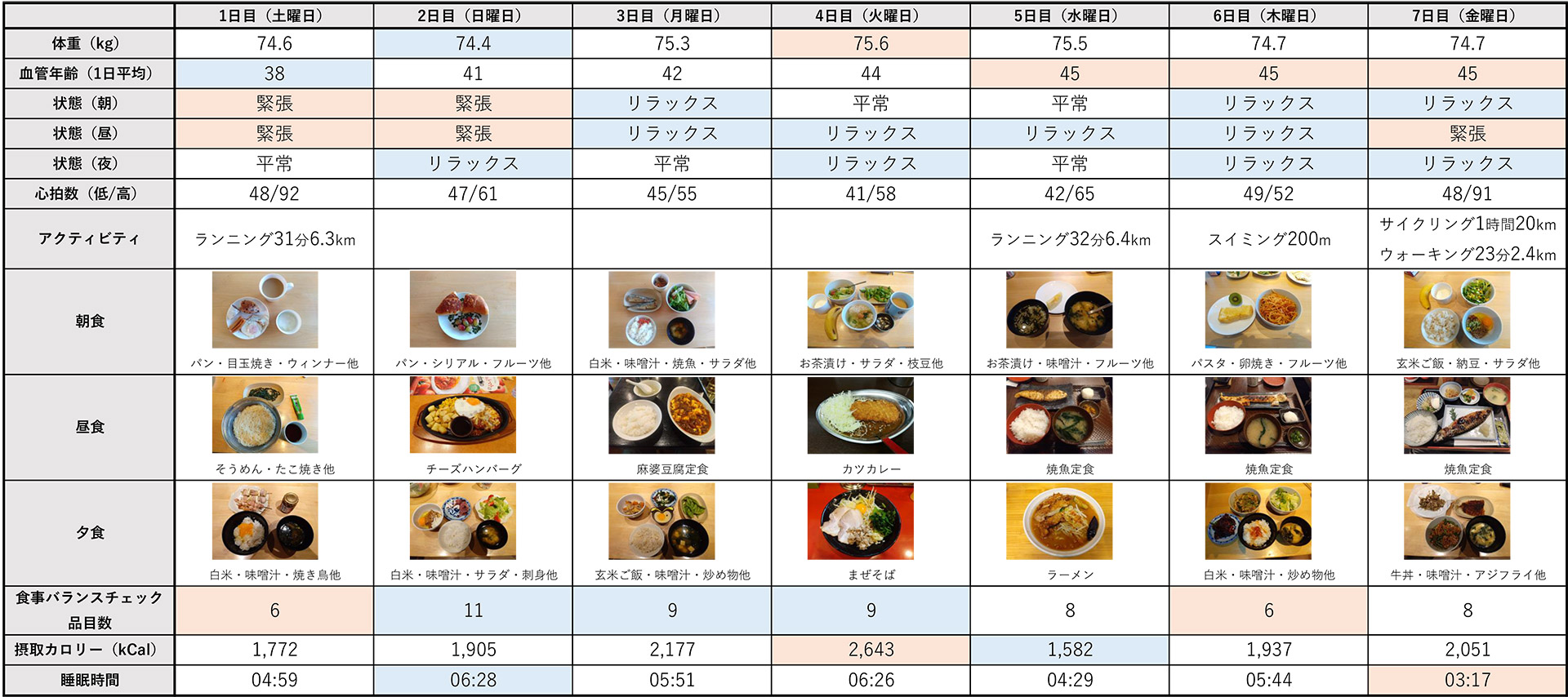 うーん……、体重は結果的にはほぼ維持したままとはいえ、悲しいことに血管年齢は1週間前の+7歳と、実年齢を超える結果になってしまった。それでも序盤の緊張状態はほぼ解消されて「リラックス」が増えたのは良かった部分かもしれない。こうして表にして振り返ってみると、カロリー過多になりがちなのは派手に外食した日ばかりで、見せることを意識して品目数を増やしたからといってカロリーが多いわけではないこともわかる。