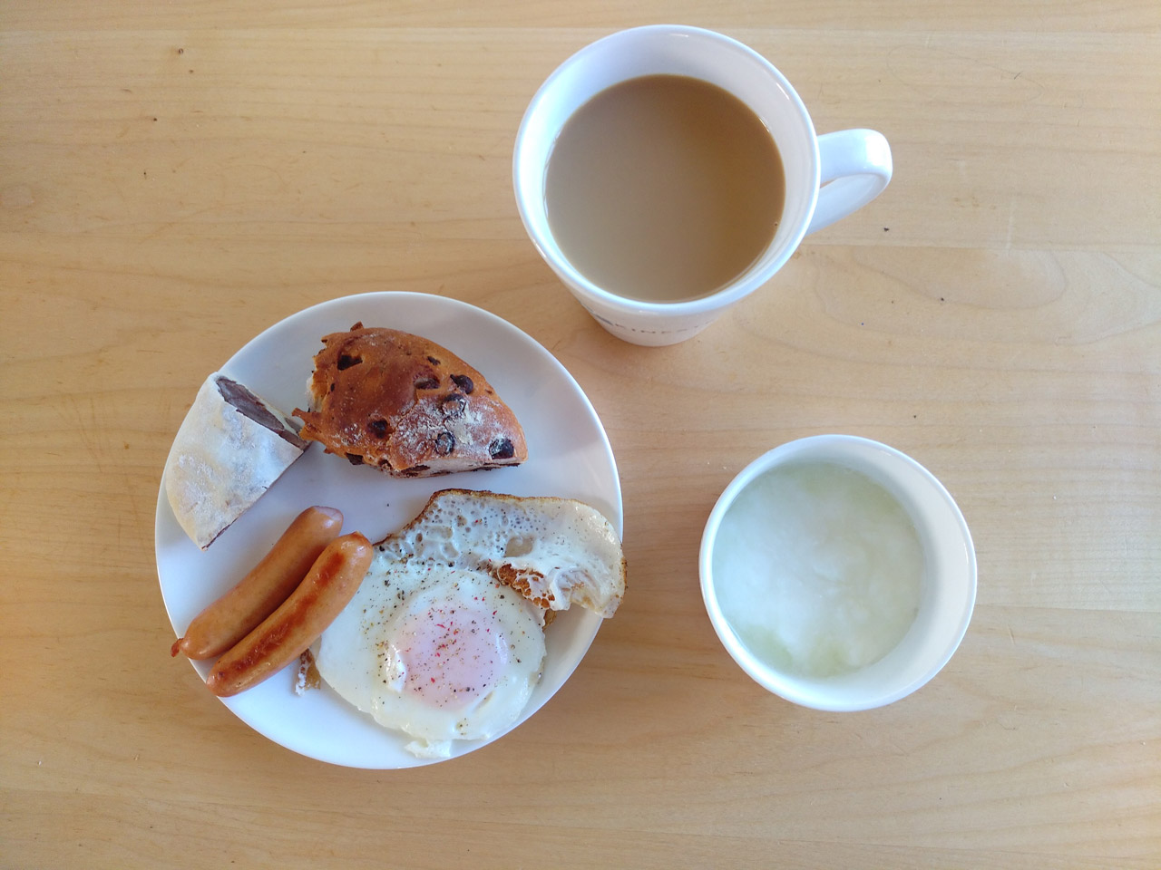 初日の朝食。目玉焼きにウィンナー、パン2種、ヨーグルト、コーヒー(無糖)