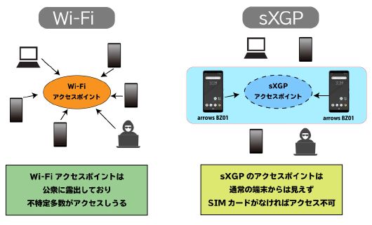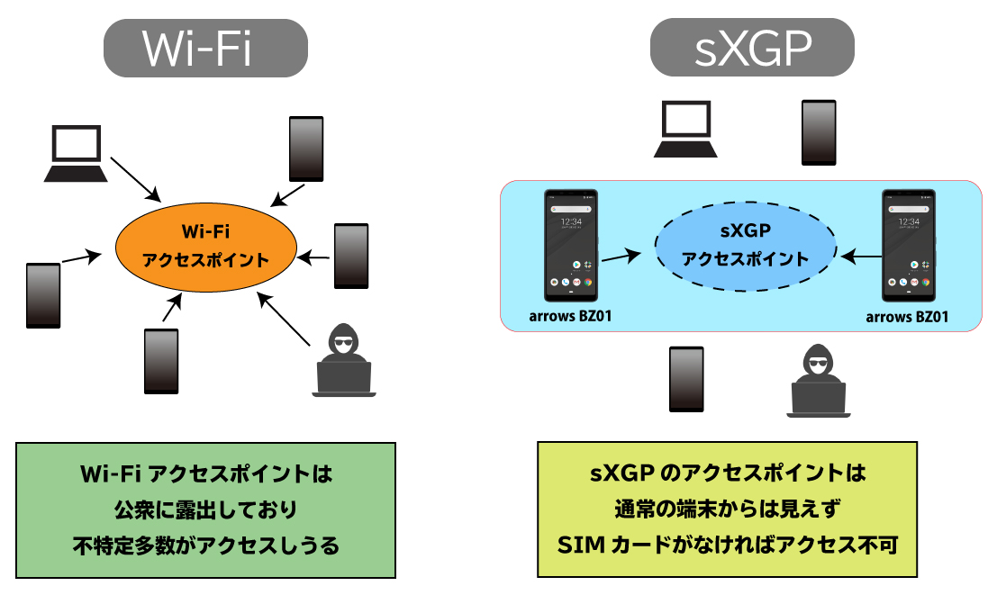 Wi-Fiのように対応クライアントが多いシステムでは、自社で管理している端末以外からもプライベートなアクセスポイントを参照できてしまうが、sXGPなら一般的なPCやスマートフォン、タブレットからアクセスポイントを参照することはできないため、不正アクセスなども発生しにくい。