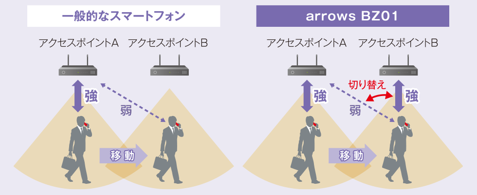 富士通のビジネススマートフォンは、もともとWi-Fi性能に定評があった端末だ。2.4GHz、5GHzのWi-Fiも利用できるうえ、Wi-Fi通信時の高性能なハンドオーバー機能も利用できるため、移動しながらの通信が安定して利用できる。