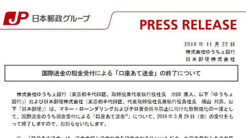 日本郵便、国際送金の現金受付による「口座あて送金」終了。テロ資金供与防止