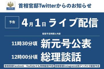 新元号公表を首相官邸Twitter、Facebookなどでライブ配信