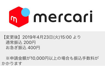 メルカリ、1万円以上の振込申請も手数料200円に。4月23日から