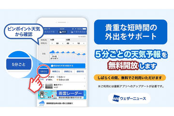 ウェザーニュース、「5分ごとの天気予報」無料開放。短時間外出サポート