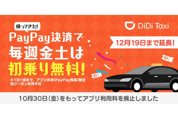 DiDi、PayPay決済で金・土曜初乗り無料を12月まで延長