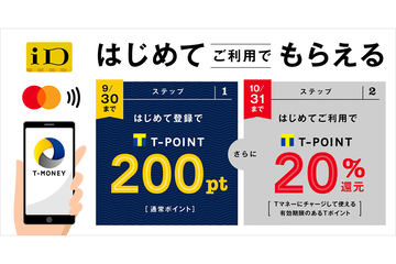 Tマネー、「かざして支払い」登録で200ポイント、支払いで20%還元