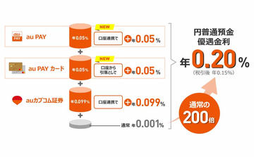 auじぶん銀行、PAY・カード・証券連携で金利0.2%。PAY→銀行自動払出も