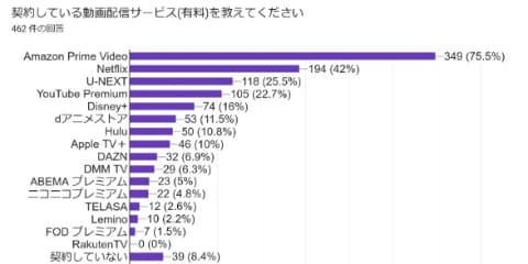 「契約している動画配信サービス(有料)を教えてください」の質問に対しては、「Amazon Prime Video」が一番多く349件で75.5%という結果になりました。Amazon Prime Videoは、Amazonのさまざまなサービスが利用できるプライム会員に登録していると利用できるので、そうした背景もあり利用者が多いことが伺えます。