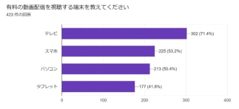 視聴する端末はテレビが最も多く71.4%、その次にスマホで53.2%、パソコンが50.4%、タブレットが41.8%という結果になりました。
