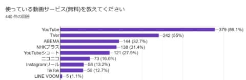 無料の動画サービスについては、YouTubeが86.1%%と最も多く、ついでTVerが55%、ABEMAが32.7%、NHKプラスが31.4%、YouTubeショートが27.5%、ニコニコが16.6%、Instagramのリールが13.2%、TikTokが12.7%、LINE VOOMが1.1%という結果になりました。