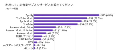 利用しているサービスに関しては、「Spotify」が一番多く313件で40%という結果になりました。ついで「YouTube Music」が254件で32.5%、「Apple Music」が229件で29.3%、「YouTube」が210件で26.9%、「Amazon Music Prime」が105件で13.4%と続きます。