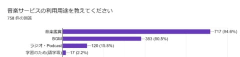 利用用途については「音楽鑑賞」が94.6%と最も高く、ついで「BGM」が50.5%、ラジオ・Podcastが15.8%という結果になりました。