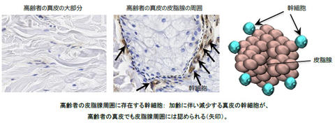 また、真皮の幹細胞が、老化細胞の老化因子の産生を抑制することを確認。真皮の幹細胞は、加齢に伴い著しく減少するが、高齢者の真皮でも皮脂腺の周囲には、真皮の幹細胞(幹細胞マーカー陽性の細胞)が豊富に存在することがわかった。つまり、皮脂腺は、その周囲に幹細胞を蓄える”リザーバー”として機能することになるという。