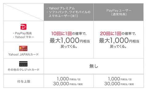 また同キャンペーン中は、ソフトバンク/ワイモバイルのスマートフォンユーザーやYahoo!プレミアム会員の場合、PayPay支払いで通常20回に1回の確率で当たる「PayPayチャンス」の当選確率が、10回に1回にアップする。