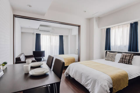 客室は40m2、1LDK。キッチンやダブルベッド2台を備え、最大5名での宿泊が可能。家族やグループで訪日する外国人旅行者をターゲットとしている。