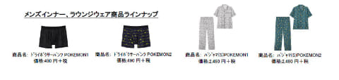 ラウンジウェアは「ねむり」をテーマに、いねむりポケモンの「カビゴン」をはじめ、「うたう」で周りのトレーナーやポケモンをねむらせることが得意な「プリン」、またそれによってねむっている「ピカチュウ」などをデザインしている。ラウンジウェアおよびパジャマの価格は1,490円(キッズ)から2,490円(メンズ、ウィメンズ)。