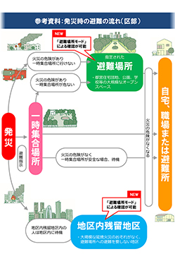 東京都は、東京都震災対策条例に基づき、地震火災から住民の生命を守るため、火災が鎮火するまで待機する場所として区部の避難場所を指定している。避難場所モードでは、避難場所や、地区内残留地区、避難地区割当などの範囲やその詳細情報を表示。また、町丁目で検索すると、その町丁目の避難先である避難場所等を確認できる。