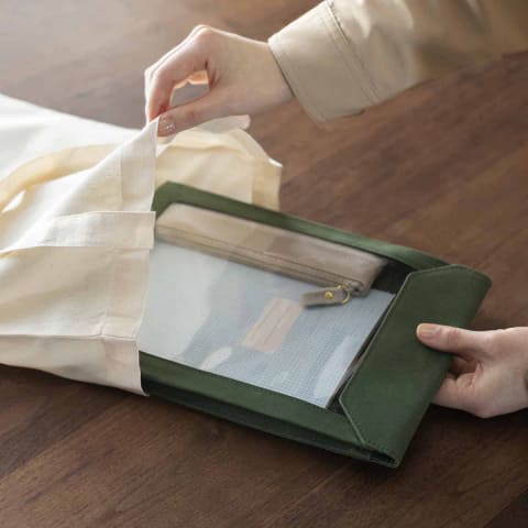 フラッティの特徴はそのほか、芯材入りのためカバンの中で自立するとともに紙類を保護できること、留め具がマグネット製で開閉がしやすいこと、透明ポケットで中身が見やすいことが挙げられている。