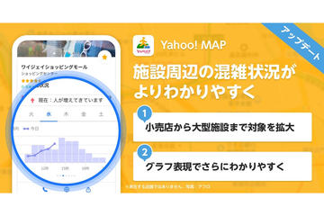 ヤフーは、Yahoo! JAPANが提供する「Yahoo! MAP」、「Yahoo!地図」、「Yahoo!ロコ」、「Yahoo!検索」において、スーパーや薬局などの店舗近辺の混雑状況が確認できる機能を追加した。Yahoo!検索は6月2日から。