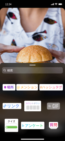 リンクスタンプは、ほかのスタンプと同様にストーリーズの作成画面にあるスタンプトレーから追加できる。リンクスタンプを選び、シェアしたいURLを入力して「完了」をタップすると、スタンプが追加される。