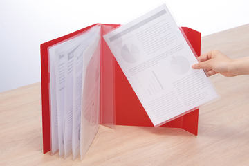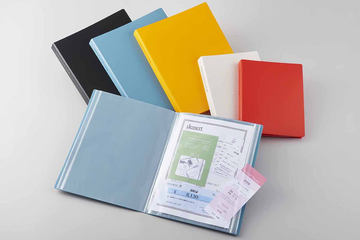 書類を収納したままホチキス留めされた資料のようにナナメにめくって閲覧・記入ができるファイルおよびホルダー。従来のファイルではポケットごとに書類を入れる必要があり、またホルダーでは書類を出さないと2枚目以降が閲覧できないという課題に着目し、開発された。いずれもサイズはA4サイズ。