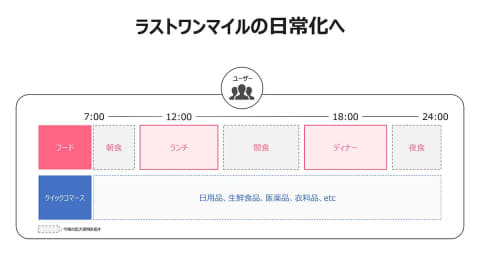 出前館との連携においては、フードデリバリーの注文が少ないアイドルタイムに日用品・食料品の配達を行なえるため、配達員が終日安定して業務を行なえるなど、「ギグワーカーの労働環境の安定化にも寄与する」としている。