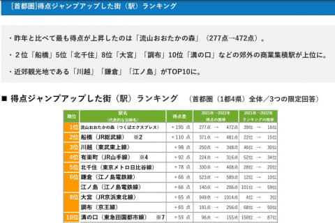 昨年と比べて最も得点が上昇したのは「流山おおたかの森」。2位が船橋、5位が北千住、8位が大宮・調布、10位が溝の口など、郊外の商業集積駅が上位に入った。また近郊観光地である川越、鎌倉、江ノ島もトップ10に入っている。