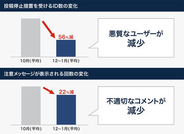 一方、コメントの「投稿停止措置」を受けたユーザーは、携帯電話番号の設定がないIDの割合が5割以上と高水準で、別のIDを利用して不適切な利用を繰り返すケースが多いという。このため、携帯電話番号をもとにして、投稿停止措置を確実に実施できるよう、コメント欄への投稿に携帯電話番号を必須化する。