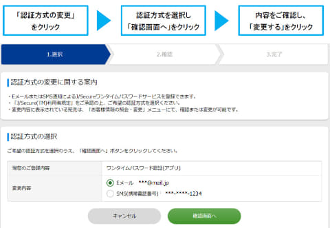 MyJCBでのJ/Secureワンタイムパスワード登録手順は、「認証方式の変更」をクリック、認証方式を選択し「確認画面へ」をクリック、内容を確認して「変更する」をクリックの3段階。MyJCB上で登録情報を変更した場合も、手続きなしでパスワード送付先を変更する。