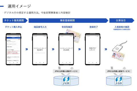 チケットの購入時の年齢確認でも、マイナンバーカードとJPKI(公的個人認証サービス)が活用できるほか、公演当日の入場資格確認にも利用可能。今後、音楽団体と連携し、具体的な活用シーンや導入・運用にかかる経費負担や実効性を検討し、2023年度には実証実験を実施する。