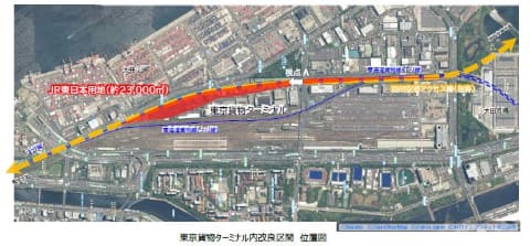 東京貨物ターミナル内改良区間は、東京貨物ターミナル内のJR東日本が保有している用地を用いて、羽田空港アクセス線の運行に必要となる車両留置線や保守基地線を整備(約23,000m2)する。